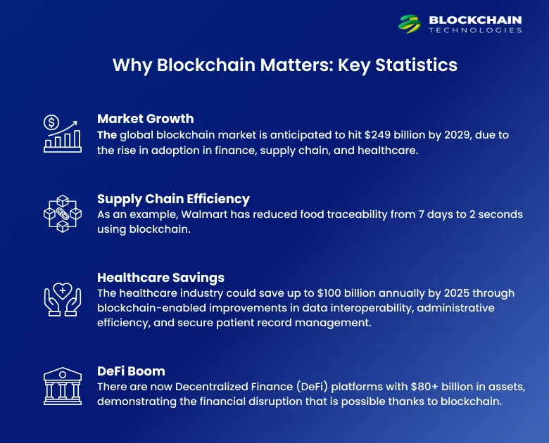 Healthcare Savings: The healthcare industry could save up to $100 billion annually by 2025 through blockchain-enabled improvements in data interoperability, administrative efficiency, and secure patient record management.